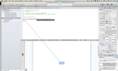 (6) Select now PushButtonViewController.h with a single click and it should appear in one of the windows. Now we need to "wire it up" to the button. We do this by holding down Control then click dragging the "wire" from the button in the PushButtonViewController.xib to the text of the PushButtonViewController.h file between the lines: